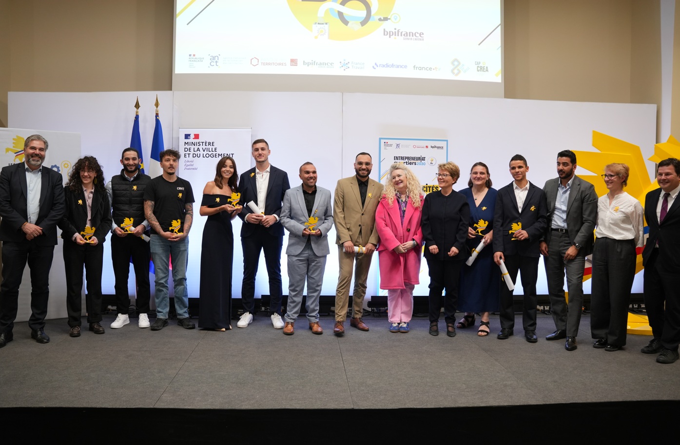 Les 7 lauréats ont été dévoilés par Corinne de La Mettrie, Directrice Générale Déléguée à la Politique de la ville à l’ANCT, Kosta Kastrinidis, Directeur-adjoint de la Banque des Territoires, Marie Adeline-Peix, Directrice exécutive en charge des partenariats, de la création et de l’action territoriale de Bpifrance, Yannick Monsnereau, Responsable Egalité des Chances et Inclusion et Diversité de France Télévisions, Samir Guerza, Directeur de mission QPV et de la Ruralité de France Travail, Bruno Laforestrie, Président du comité égalité diversité de Radio France, en présence du Club XXIè siècle, de BGE, et de l’ensemble des réseaux d’accompagnement du collectif CAP Crea.